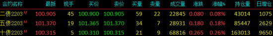 2021年12月22日,国债期货各品种主力合约全线上涨。截至下午收盘,十年期主力合约涨0.26%;五年期主力合约涨0.18%;二年期主力涨0.08%。