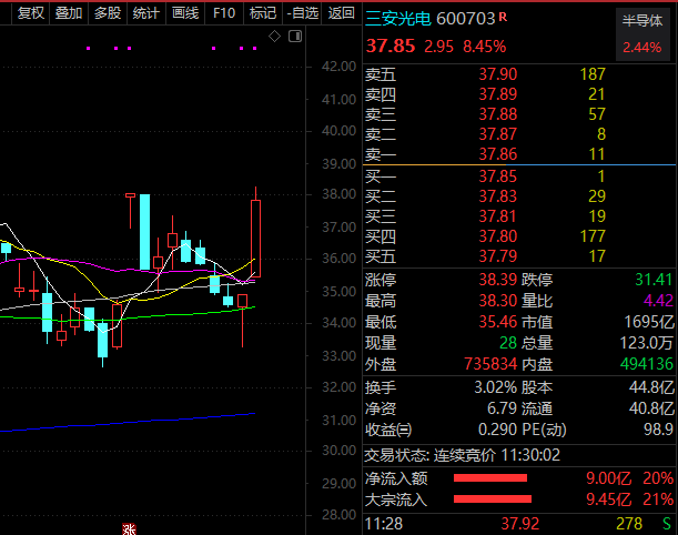 或许是受到上述消息影响,今天早盘三安光电高开高走,盘中一度冲击涨停。截至上午收盘,该股涨8.45%,收报37.85元。